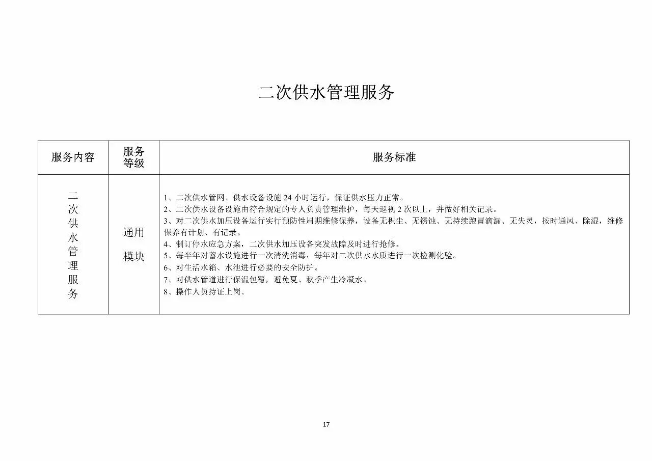 第十七条物业服务成本或者物业服务支出由管理服务人员的工资、社会保险和按规定提取的福利费、物业共用部位及共用设施设备日常运行和维护费用、绿化养护费用、清洁卫生费用、秩序维护费用、物业共用部位及共用设施设备及公众责任保险费用、办公费用、管理费分摊、固定资产折旧以及经业主同意的其它费用组成。供水企业已接管物业服务区域内供水设施的,二次加压运行费用不计入物业服务支出或者物业服务成本。